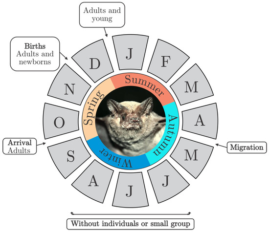 The colony of La Calera is maternal and migratory, as are others in South America and numerous in North America. These kind of colonies are only present in temperate zones, from 27°S to 31°S latitudes [16,17,20,42] and 25°N to 38°N [35], despite the fact that T. brasiliensis is more widely distributed in America. The annual activity cycle of all these colonies are seasonally similar, with arrival to the shelters in early- to mid-spring, births in late spring, and migrations in late summer or early autumn, showing patterns of gradualness until the shelters are empty or just inhabited by a small group of individuals that remain during the cold seasons, as is shown in Figure 7, Figure 8, Figure 11, Figure 12 and Table 1 [15,16,17,18,20,30]. There is no information about migratory routes in the South American colonies, unlike in North America where it is known that they migrate towards lower latitudes [45,46], reaching distances of up to 1800 km [47]. These pulses of migrations in coordination with the reproduction of this species are associated with environmental factors and food availability [16,48].
