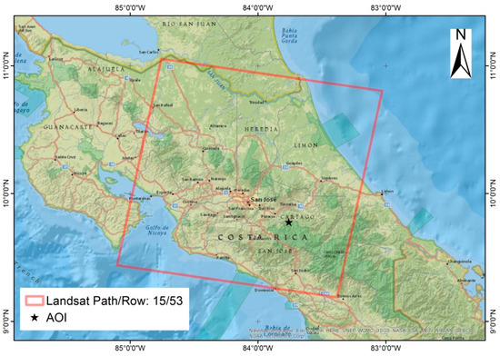 Geographical location of the area of interest (AOI), the red polygon corresponds to the Landsat tile for path and row 15/53.