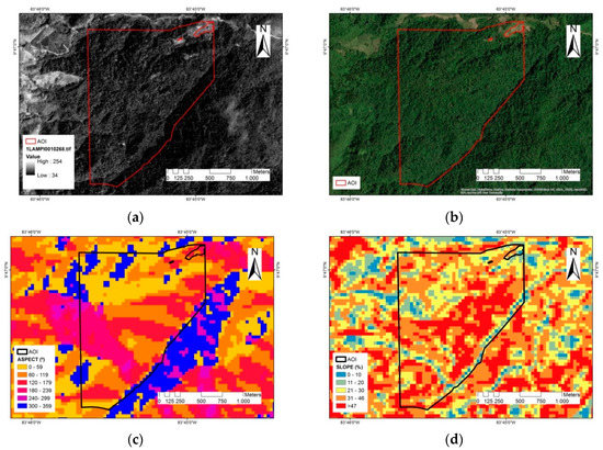 Area of Interest (AOI) (a) Aerial single frame of the area 11 August 1992, (b) Very high-resolution satellite image 16 January 2017 (DigitalGlobe), (c) Aspect (°), (d) Slope (%).
