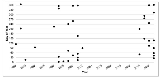 Dates expressed as year and day of year when the 39 selected images were available for the analysis.
