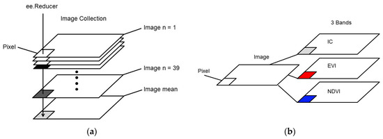 Example of computation of descriptive statistics using the ee.Reducer algorithm across the stack of 39 images (mean in the example) (a). Each image has three bands IC, Enhanced Vegetation Index (EVI) and Normalized Difference Vegetation Index (NDVI) (b).