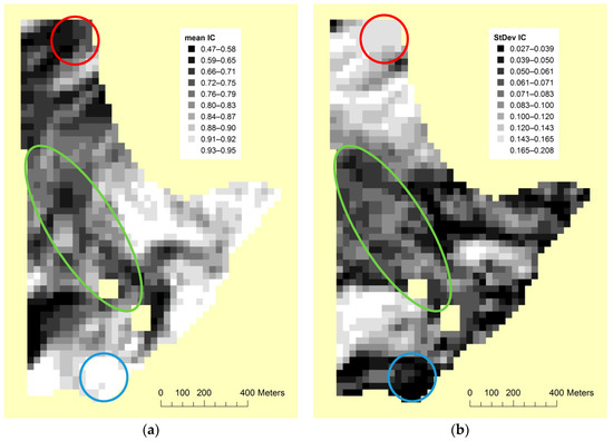 Spatial distribution of the mean illumination condition (a) and its standard deviation in the area (b). Each pixel shows the result of the 39 selected images. Red and blue circles show areas with opposite patterns. The green ellipses show areas with low mean IC and variation.