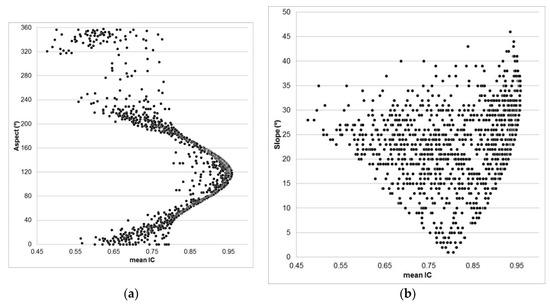 Scatter plot showing mean IC and aspect (°) in (a) and IC and slope (°) in (b) at the pixel level.