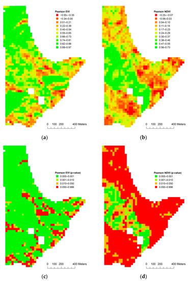 Spatial distribution of the Pearson correlation values between EVI~IC (a); Pearson correlation values between NDVI~IC (b); significance values (p < 0.05) for Pearson correlation between EVI~IC (c); and significance values (p < 0.05) for Pearson correlation between NDVI~IC (d). Each pixel shows the result of the 39 selected images.