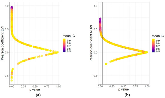 Scatter plot showing p values and Pearson correlation coefficient values for the correlation EVI~IC (a) and NDVI~IC (b). The black vertical line represents p = 0.05, being all points to the left significant at p < 0.05. Colors represent low mean IC values (purple) to high mean IC values (yellow).