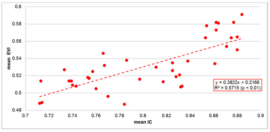 Scatter plot of the mean illumination condition (IC) versus the mean EVI value for each of the 39 selected images.