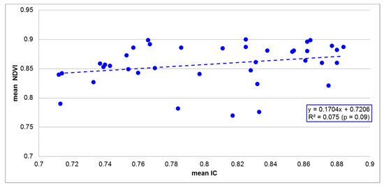 When the relationship between EVI~IC and NDVI~IC is described comparing the mean values for each selected image (n = 39), EVI and IC showed a significant and positive dependence (R2 = 0.5715, p < 0.01) (Figure 11), whereas NDVI and IC showed a very small to almost no dependence (R2 = 0.075, p < 0.09) (Figure 12). While these results corroborate the higher sensitivity of EVI and the lower sensitivity of NDVI to the effect of IC, they are not able to explain alone the VI~IC variations found when we examine the image at the pixel level.