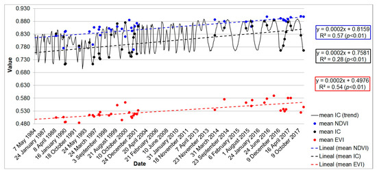 The modeling of IC for all images in the period studied is shown in Figure 13. The mean IC value in the area shows an overall increase over time. This can be clearly observed comparing images close in date but separated in years, where the increase in IC occurs to a similar degree for every date and month compared (Figure 15). In more detail, the mean IC trend experiences an overall increase with a slight drop between the years 1989–1993 and then an increase again. It can also be observed that due to missing images in some dates between the years 1984–2012, the IC seasonality pattern cannot be as clearly seen as after the year 2012 to present when the coverage of images is more complete. Overall, EVI and NDVI show higher values in the recent period 2014–2017 than in the previous period 1988–2002 regardless of the seasonal effects. The lack of clear images between the period 2003–2013 is due partly to cloudiness and to the Scan Line Corrector (SLC) failure in Landsat 7 [29].