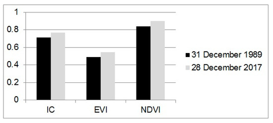 Temporal trends for IC, EVI, and NDVI show positive and similar slopes and are highly significant (p < 0.01) (Figure 13). NDVI shows the best adjustment (R2 = 0.57, p < 0.01) followed by EVI (R2 = 0.54, p < 0.01) and then by IC (R2 = 0.28, p < 0.01), the latter which showed the poorest adjustment due to the high variation as a result of known seasonal changes. For the 39 selected images, the minimum mean IC value (0.71) corresponds to the date 31 December 1989 with mean EVI and NDVI values of 0.48 and 0.84 respectively. The maximum mean IC value (0.88), corresponds to the date 4 September 2016 with mean EVI and NDVI values of 0.59 and 0.88 respectively. A comparison between two close images, both from the dry season but separated 28 years also depicts the effect of the increase of mean IC in both mean EVI and NDVI (Figure 14).