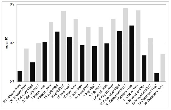 Comparison of mean IC for images close in date but separated in years. The criteria of selection were first close dates, then the highest number of years in difference.