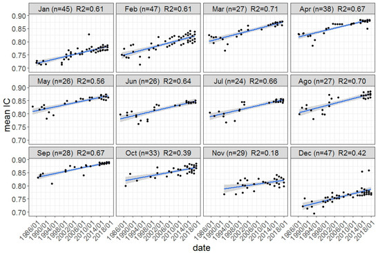 Temporal trend of mean IC in the study area by month and year for all Landsat images selected (n = 397). Blue lines represent regression lines and grey areas confidence interval (CI) at 95%. The number of images available for each month(n) and R2 are displayed.