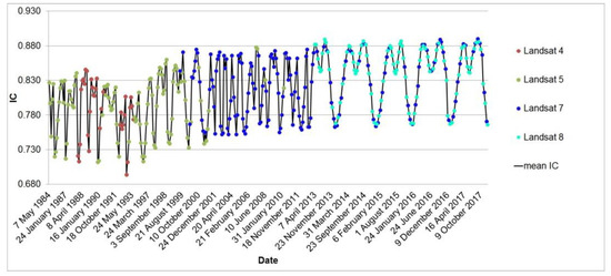Temporal trend of IC in the study area for all Landsat images selected (n = 397) and all Landsat sensors.
