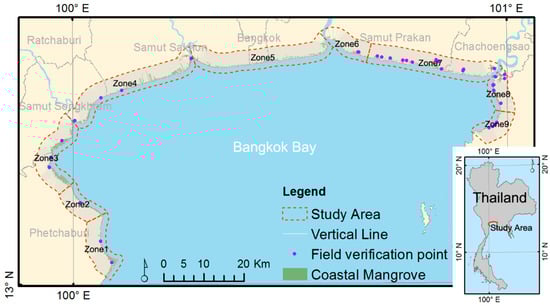 The Bay of Bangkok (study area shown in Figure 1) is part of the Gulf of Thailand and its coastline comprises intertidal mudflats intersected by deltas and estuaries associated with the Chao Phraya River, the Tachin River, the Meckl River, and the Mamba River. Over time, dense coverages of mangroves along its coast have been destroyed by human settlements, aquaculture, and salt pans, so that the current distribution is a narrow strip of fragile mangrove ecosystems at the outermost edge of the land [34].