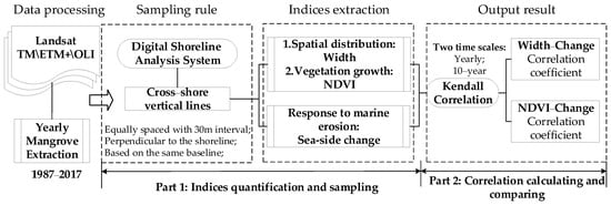 The flow chart, shown in Figure 2, graphically summarizes our method to quantify the relationship between mangrove responses to marine erosion, spatial distribution, and vegetation growth.