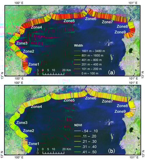 Transect lines, of 5 km length, used to calculate mangrove width and NDVI status in 2017. (a) Shows the transect-based spatial distribution of mangrove width; (b) shows the same distribution for NDVI; the background Landsat image was obtained on 3 February 2018.