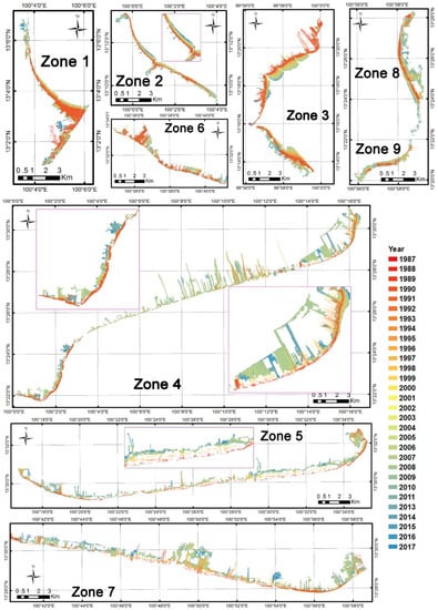 Additional observations from Figure 7 are that the trend across nine regions can be divided into rapid growth phases in 1990–1997 and in 2004–2008, and slow growth or retreating phases in 1987–1989 and 2000–2003. While the retreating areas (Zones 4, 5, and 7) showed significant retreat in most years, the most significant retreats occurred in 2001–2009. After 2010, the retreating reduced in Zones 4 and 5. In 2015–2017, Zone 4 extended by growing out to the sea. Since 1990, mangroves in the growing regions (Zones 1, 2, 3, 8, and 9) began to recover and extend out to the sea. After 2004, the rates of growth slowed in the five regions, and some retreated slightly. The largest retreat occurred in Zone 8, which retreated 78 m in 2009.