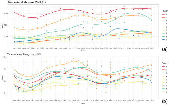 Yearly time-series of mangrove width and NDVI. (a) The trend of mangrove width in nine regions from 1987 to 2017; (b) the trend of mangrove NDVI in nine regions from 1987 to 2017.
