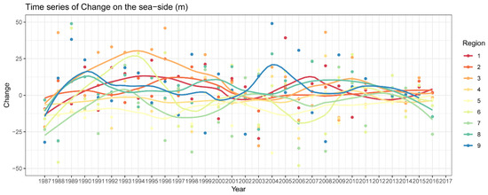 Comparative analysis of trends within and between the regions were analyzed from annual changes across 1987 to 2017 of three Loess-regression trends: (1) Change of mangrove boundary at the seaside; (2) width; and (3) NDVI. The trends of the width and NDVI are displayed in Figure 6, and the trend of coastal mangrove change on the seaside are shown in Figure 7. Regressions were computed across the 30 years between the annual change of mangroves on the seaside (in meters), the annual mangrove width (in meters), and the annual mangrove NDVI.