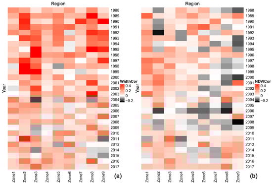 The thermogram of Kendall tau-CC (correlation coefficient, CC) results for Width-Change (a) and NDVI-Change (b) at the yearly scale. Positive values (warm tones) represent similarity in the profile of ranked values, while negative values (gray tones) indicate a disparity in the rank profile. White values indicate irrelevant results for the correlations. The color depth represents the level of the correlation coefficient.