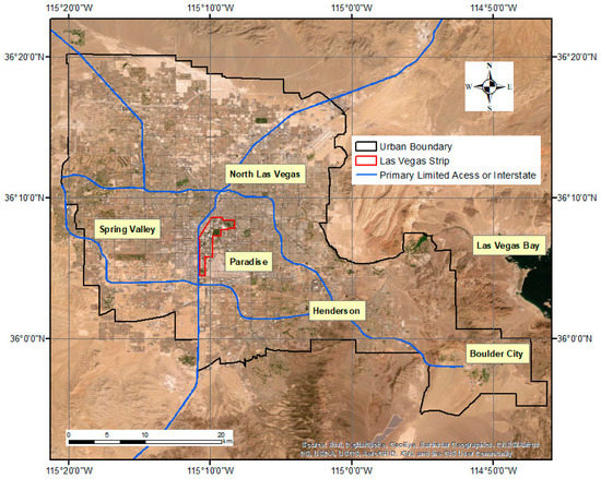 Our study area is the city of Las Vegas, a subtropical desert city located within the greater Mojave Desert (Figure 1). As the most populous city in Nevada, Las Vegas has experienced a fast-urban expansion with an average area increase of 40 km2 per year from 1990 to 2010 [2]. The population in Las Vegas has grown significantly since the 1960s with an average increasing rate of 85.2% from 1990 to 2000. The estimated population in 2018 was 648,224 million [34]. The rapid growth is largely driven by the role of the city as a cultural, financial, and recreational center in Nevada. The average daytime temperature in June is 41 °C, with the maximum temperature reaching 45 °C [35]. On average, there are 310 sunny days per year, and the average rainfall is only 2.8 mm [35]. Las Vegas experienced the most intense UHI effects in 2016, with a 4 ℃ temperature difference between its metropolitan area and the surrounding rural area [36].