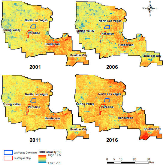 Surface urban heat island intensity (temperature difference between each land surface temperature (LST) pixel in the city and the mean LST of the buffer) over Las Vegas for 2001, 2006, 2011, and 2016.