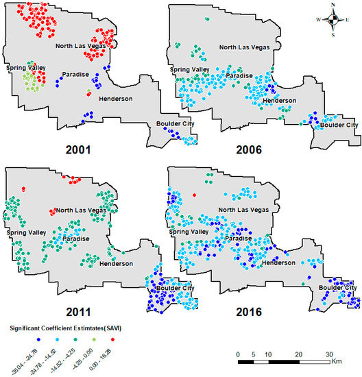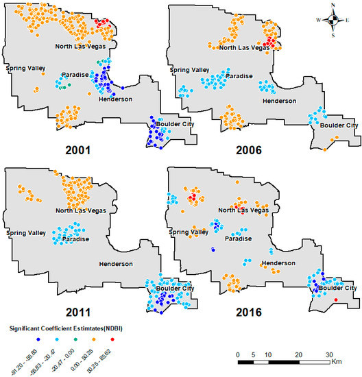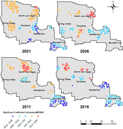 Figure 4, Figure 5 and Figure 6 show the locations and values of local estimates for the four years for SAVI, NDBI, and MNDWI, respectively. Only significant estimates were plotted (p < 0.05). From Figure 4, significant points were mostly found near Las Vegas Strip and Las Vegas downtown in all four years. Consistent with the correlation and global regression analysis, we found an intensifying relationship between the SAVI and SUHI intensity with more significant locations observed in 2016 than 2011. While only negative associations were found with global models, positive associations were identified for a few places in 2001, which turned non-significant or negative in the later years. The stronger relationship was not only supported by the increased number of significant locations, but also the size of the estimates. Two of the three clusters of positive places in 2001 disappeared in 2006, and the one located in Spring Valley turned into a negative cluster extending to the Strip in 2006 and 2011. The negative relationship continued to dominate the region, with a significant increase in both the number of places with negative estimates and the magnitude of the estimates.