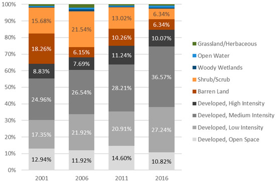 In contrast to conventional UHI studies, we identified a negative heat island effect, which is prevalent in the northwestern part of the city (Figure 3). The negative urban heat island effect, commonly referred to as an urban heat sink (UHS), has received the attention of UHI researchers since the 1990s [56]. According to previous studies, a UHS is mostly found in forests, agriculture, and other green spaces in a city [33]. The presence of the UHS in desert cities was recently discussed by Fan et al., wherein they referred to as the oasis effect [2]. To understand the land composition of the UHS in Las Vegas, we calculated the percentage of each LULC type in areas identified as a UHS (negative SUHI values) (Figure 8). Low and medium intensity-developed areas constitute a significant proportion of the UHS areas. Collectively, the two land-use types account for 42.31% of the UHS in 2001, which increases to 63.81% in 2016. The UHS is closely associated with the LULC condition in the urban area and its rural surroundings. Because buildings and other impervious surfaces have higher thermal inertia than open soil, built-up areas tend to have a lower rate of temperature change than the surrounding desert lands [2]. Therefore, a UHS can be expected during the first hours of the day when the city starts to warm up [56]. Similarly, a UHI is more likely to happen during sunset hours as the city starts to cool down. Since both images were acquired around 10 am local time, a UHS is most likely to occur in the developed areas.