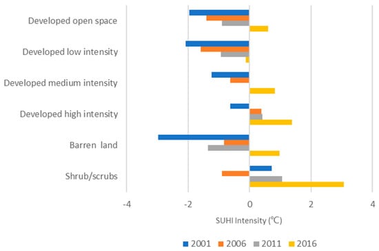 Results show that Las Vegas has undergone rapid urbanization over the 15 years. 24.2% of barren land was converted into developed areas (developed open space, developed low, medium, and high-intensity areas), and 21.8% of open space was converted into developed low/medium/high-intensity areas. With increased urban areas and intensity, 87.3% of Las Vegas had experienced an increase in the SUHI from 2001 to 2016. Figure 9 shows the mean SUHI intensity for major LULC types in the four years. In 2001, a UHS effect was found for all LULC types except for shrub/scrub, where a classic SUHI effect was observed. Over the 15 years, three types of changes occurred. For some LULC types, the UHS became smaller in size, indicating a weaker heat sink (cooling) effect. The LULC type in this category is developed in low-intensity areas. Even though the UHS effect was very weak, the cooling effect remained in 2016. For some other LULC types, the heat sink was so weak that it became a heat island. Examples in this category include developed open space, developed medium/high intensity, and barren land. Lastly, there is an increase in the SUHI score for shrub/scrub, showing an enhanced heat island effect. As discussed before, buildings can help lower surface temperatures in many ways. This is supported by the UHS scores for all three developed areas in 2001. However, as urban intensity increases, the cooling effect is largely offset by the warming effect from an increased number of buildings in a unit area. Comparing the results for the three types of developed areas, warmer temperatures (smaller UHS or larger UHI) are associated with higher urban intensity, while a UHS was observed for low-intensity developed areas for four years consistently. Overall, rapid urbanization in Las Vegas has led to increased surface temperatures over the city, a weakened heat sink effect, and an enhanced SUHI effect.
