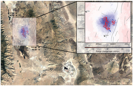 - Fialko, Y.; Simons, M. Deformation and seismicity in the Coso geothermal area, Inyo County, California: Observations and modeling using satellite radar interferometry. J. Geophys. Res. Solid Earth 2000, 105, 21781–21793. [Google Scholar] [CrossRef]