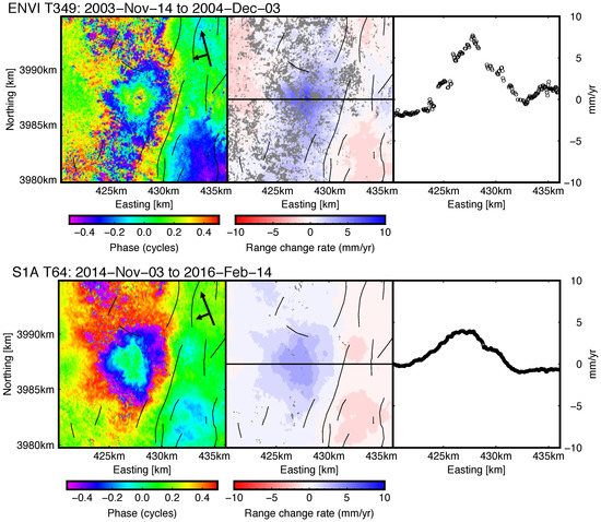 - Reinisch, E.C.; Feigl, K.L. Envisat Track 349 and Sentinel-1A Track 64 Interferometric Synthetic Aperture Radar Data of Coso Geothermal Field, California, USA, 2004–2016; Technical Report, DOE Geothermal Data Repository; University of Wisconsin: Madison, WI, USA, 2019; Available online: http://gdr.openei.org/submissions/1145 (accessed on 26 June 2019).