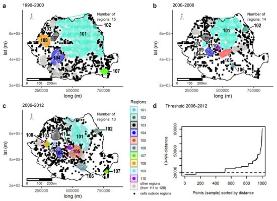 The spatial clustering procedure was run three times, for each study period independently. The result consists of different number of regions for each period, from 15 (in 1990–2000) to 13 (in 2006–2012) (Figure 1a–c). We also noticed that some regions have common cores in more than one study period, while others are present just in one of the periods. The regions with continuity across all periods change their shape and extent around one stable core. These regions are of greater interest for our study. The regions that can be identified in at least two study periods received arbitrary numbers from 101 to 110. Other less important regions, with no continuity, received numbers from 111 to 128.