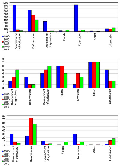 The results of computing the correlation coefficients and their significance (associated p-values) are showed in Table 1. The results indicate that not all trends are significant. Raw data confirm the decreasing trend of total affected area from 3098.807 km2 in 1990–2000 to 766.365 in 2000–2006 and 719.913 during 2006–2012, also found by previous studies [89,103], and reveal decreasing trends for the abandonment and development of agriculture, and forestation. Ranked data indicate increasing trends for the deforestation and urbanization, while the development of agriculture slows down. Percentage data show no significant trends. These results confirm the previous findings only partially, through the decreasing trend of the development of agriculture.