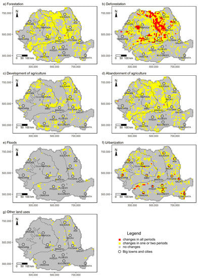 Urbanization is a process directly related to the concentration of population [111]. However, the spatial pattern of this process is not well defined except one situation: cells with changes in all three periods (red squares on the Figure 3f) are strongly linked with large cities, such as Suceava, Iaşi, Bacău, Focşani, Galaţi, Constanţa, Bucharest, Ploieşti, Braşov, Cluj-Napoca, Oradea, Arad, Timişoara, Craiova, Piteşti and some other areas, such as those related to mining activities [112].