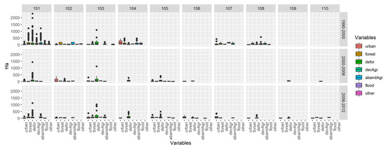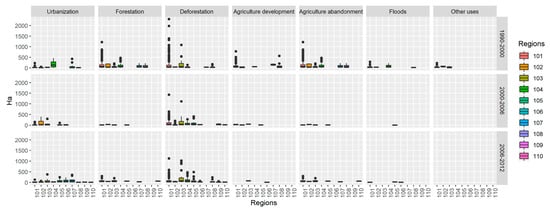 The profiles of the regions are analyzed with respect to the land use changes by grid cells in Figure 4, and with respect to the variation of transitional dynamics by classes and study period in Figure 5. In more detail, Figure 4 allows for looking at the most prominent transitional dynamics affecting each clustering region identified by the spatial analysis during the three periods, while Figure 5 allows for a global comparison of the transitional dynamics across the three periods. The grouping of transitional dynamics is presented using box-and-whisker plots, which are extremely useful for showing variability inside and outside quartiles. Presenting the results in this way is important because the configuration of regions is determined using the rule of vicinity and not that of homogeneity. Such an approach is useful for revealing spatial relationships among regions and their extent. However, the resulting regions are less homogenous, which perfectly justifies the use of box-and-whisker plots.