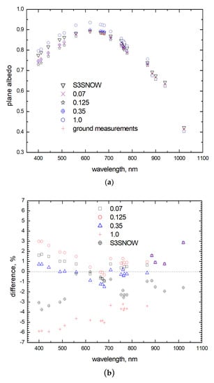 Also, one can derive the underlying snow spectral reflectance function using Equations (1) and (2). Therefore, the procedure for the determination of Case 1 spectral albedo from space is straightforward. It was validated in [6]. Generally, the errors in the retrieved albedo are below 1–3% depending on the wavelength.
