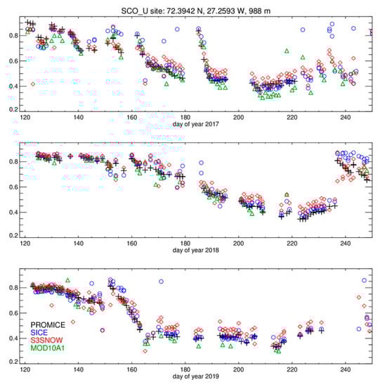 At the PROMICE SCO_U location (Figure 2 and Figure 3, Table 3) on the eastern ice sheet, where clear sky conditions are common, we observe in three May–September years (2017, 2018, 2019) over a wide (0.52) BBA range (from 0.33 indicative of impurity rich bare ice to 0.85 indicative of dry clean snow cover) a very similar temporal pattern in both the ground observations and from the OLCI retrievals.