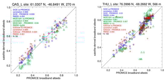 Examples of satellite derived and ground observations of snow and bare ice albedo. The left figure includes both the S3 Snow and the current processing results for the site QAS_L. The comparison uses cases only when all retrievals are available, i.e., including those from MODIS MOD10A1 [15]. The right figure is the same except for the site THU_L. The symbols have the following meanings: PROMICE (crosses), SICE (circles), S3SNOW (rhombus), MOD10A1 (triangles).