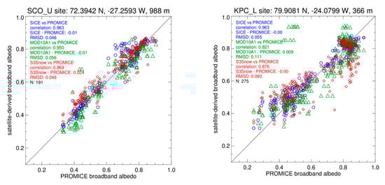 We validate broadband albedo measured in the 0.3–2.4 micron wavelength range using ground measurements from fifteen Programme for the Monitoring of the Greenland Ice Sheet (PROMICE) automatic weather stations, with albedo data already described with more detail in [6]. In comparisons presented here, the closest hourly observations are considered. Occasionally for northern sites (KPC_L, KPC_U), there are multiple comparisons each day. Clear sky conditions are estimated from downward longwave irradiance data after [6]. A total of 4,146 individual comparisons are made. The PROMICE BBA data include a correction for measurement platform obstruction of the radiometer field of view [14] that increases average PROMICE albedo by 0.034.