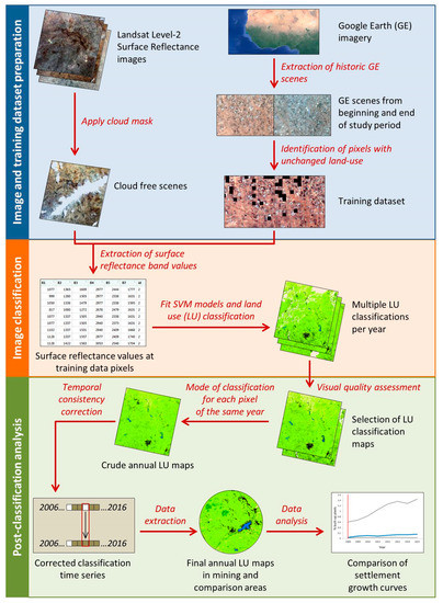 The preparation, classification and post-classification steps to derive urban growth metrics from satellite imagery applied in this study are explained in the following sections and visualized in Figure 2.