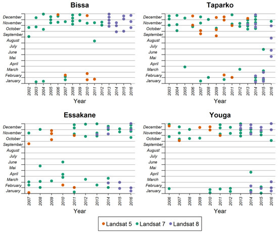 Figure 3 depicts the capture dates of the retained satellite images that yielded high-quality land use maps using our approach. In total, 211 images were included for the post-classification steps (see Table 1). Of note, the vast majority of retained images were taken in the beginning (i.e., January and February) or the end (i.e., October–December) of the calendar year. These months coincide with the dry season in Burkina Faso.
