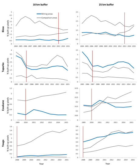 Comparison of the percentage of built-up pixels over time. Blue lines depict settlement growth in mining areas over time. Gray lines show settlement growth in comparable nearby districts within a 10 km (left panels) and 25 km (right panels) radius. Red vertical bars indicate the opening year of the mine.