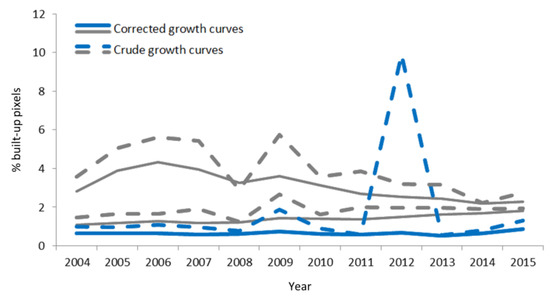 When comparing the growth curves of the predominantly rural areas selected for this paper with those of mainly urban areas reported in other publications, three patterns were observed: (i) the availability of Google Earth imagery influenced the classification accuracy; (ii) negative growth was observed in some study areas; and (iii) there is limited potential for additional post-classification correction approaches in our study setting. Each of these observations is discussed separately in the subsequent paragraphs.