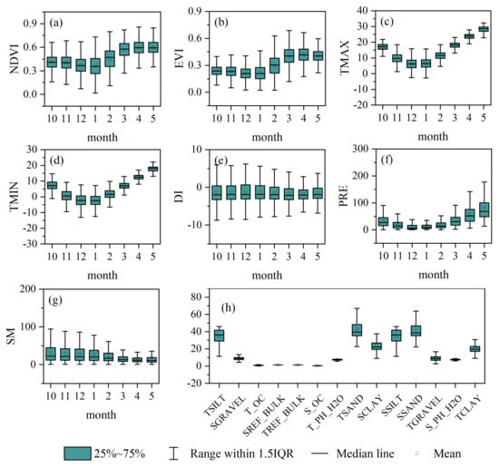 The distribution of NDVI (a), EVI (b), TMAX (c), TMIN (d), DI (e), PRE (f), SM (g) and the physical and chemical properties of the soil (h) for available data (2001–2014) for the monthly period. The distribution of soil properties for available data for 629 counties in China. 1: January; 2: February; 3: March; 4: April; 5: May; 10: October; 11: November; 12: December. NDVI: normalized vegetation index; EVI: enhanced vegetation index; TMAX: monthly maximum temperature; TMIN: monthly minimum temperature; DI: palmer drought severity index; PRE: monthly precipitation accumulation; SM: soil moisture; SILT: silt content; GRAVEL: volume percentage of crushed stone; OC: organic carbon content; REF_BULK: soil bulk density; PH_H2O: hydrogen ion concentration; SAND: sand content; CLAY: clay content; T and S represent the topsoil layer (0–30 cm) and the subsoil layer (30–100 cm), respectively.