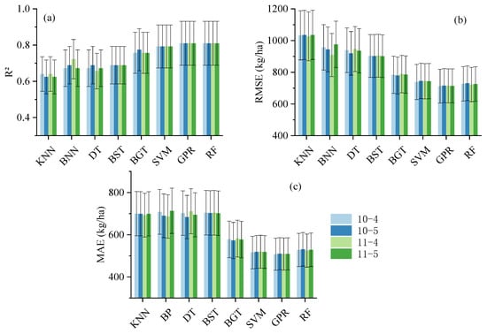 R2 (a), RMSE (b) and MAE (c) skill scores of eight models for winter wheat in different growth periods at the county scale based on five-fold cross-validation results in different time windows. (The unit of RMSE and MAE is kg/ha; 10-4: from October to April; 10-5: from October to May; 11-4: from November to April; 11-5: from November to May.). The error bar represents percentage error, instead of standard error. The top of the line stands for the value plus 15%, and the bottom of the line stands for the value minus 15%.