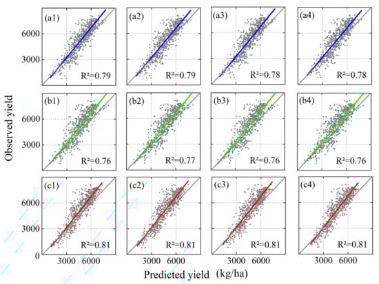 Scatter plots of observed yield and predicted yield of GPR, SVM and RF models for different growth periods of winter wheat at the county scale. One point represents a county (the alphabets (a), (b) and (c) represent GPR, SVM and RF; numbers 1~4 represent October~April, October~May, November~April, and November~May, respectively).