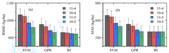 We plotted the RMSEs and MAEs of three models by the four growing periods to investigate the impacts of the selected time window on the prediction accuracy (Figure 5). RMSEs (Figure 5a) and MAEs (Figure 5b) were shown in the order of November~April > October~April > Novemeber~May > October~May, regardless of the algorithms or evaluation indicators. The highest accuracy was indicated by the time window of October~May, with the smallest errors (RMSE and MAE). Thus, the closer to the sowing date (the end of September) for time window opening, and the same ending to harvesting date (June), the higher the prediction accuracy will be, which was more strongly substantiated by SVM models. The finding suggests that the prediction accuracy will be significantly improved as more observations during growing seasons are provided by such within-seasons predictor variables. Johnson [] further pointed out that more dates included will accumulate the entire season information and the developed model would perform better than those from only some dates. Moreover, many studies have also found good relationships between wheat yield and late-season NDVI at the regional scale [,], suggesting NDVI prior to harvest can provide good estimates of regional yield. Beyond the above, other attributes such as climate and soil conditions during early sowing have important implications for later crop growth [,]. Hence, more information available during crop growing season could improve the accuracy of winter wheat yield prediction.