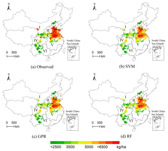 The spatial pattern of the predicted yields by three machine learning models is almost the same as that of the observed yields despite a slight difference (Figure 6). Moreover, the higher yields are located mainly in the eastern areas, while lower yields in the western areas (Figure 6a). However, the areas with higher yields predicted in the east are less than those of observations, especially for SVM (Figure 6b) and GPR (Figure 6c). The eastern areas in the study are the so-called Huang-Huai-Hai plain, the main producing area of winter wheat in China, with flat terrain, fertile soil, suitable climate, and good irrigation conditions. The southwest areas are mainly dominated by rice cultivation, with steep terrain, where winter wheat yields are generally lower and planting areas are fewer. We also found that some extremely high yields (>6500 kg/ha) are difficult to predict, indicating the limitations of the machine learning technique.
