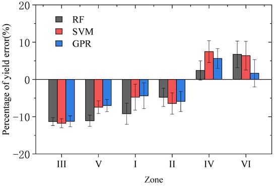 Crop yield is driven by the interaction of management, soil, and weather conditions. The yield would vary not only from season to season but also from location to location []. To investigate the prediction errors comprehensively, we summarized them according to the areas and the machine learning types (Figure 7). The results showed that the errors of machine learning algorithms do vary by the agricultural zones. With exception of zone III and zone V, the errors of other agricultural zones are all <10%. Moreover, the positive errors suggest overestimations in zone IV and zone VI, and underestimation for the other four areas. Overestimated yields are generally located in the humid and semi-humid areas.