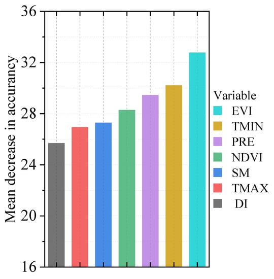 To investigate the importance of different variables for the winter wheat yield prediction in China, we calculated the decreased accuracy (mean square error) after removing one variable from the RF model. The mean decrease in accuracy indicates the amount by which the random forest model’s prediction accuracy would decrease if one variable is excluded. The larger the decreased accuracy for a prediction variable, the more important the variable is (Figure 8). Mean square error represents the relative importance of the variables. Soil physicochemical properties are generally kept constant during a short period, so we haven’t selected soil physicochemical variables. Importance of prediction variables is ordered as: EVI > TMIN > PRE > NDVI > SM > TMAX > DI. EVI is more important for winter wheat yield prediction than NDVI, which is consistent with the study by Bolton et al. []. They stated that MODIS-EVI provided relatively better results for predicting crop yields than MODIS-NDVI []. As two variables related to temperature, TMIN contributed more significantly than TMAX to the accurate prediction of wheat yield, implying a greater impact of TMIN on wheat yield than TMAX [].