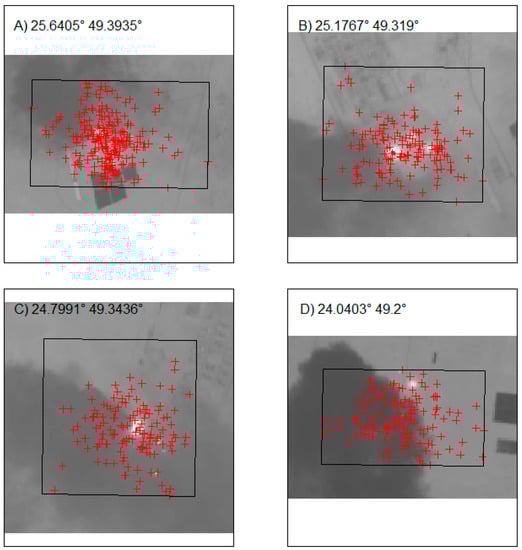 Active fire detection locations from Moderate Resolution Imaging Spectroradiometer (MODIS) Aqua, Terra and Visible Infrared Imaging Radiometer Suite (VIIRS) are shown as red crosses over the four (A–D) flares illustrated in Figure 1. Central geographic coordinates are shown for each flare site illustrated in Figure 1 is also shown in each frame. The black box is the smallest spatial extent that encompasses all detections in the study period. Background Landsat 8 2.2 μm band 7 reflectance over the extents padded by 1 km is shown to provide spatial context.